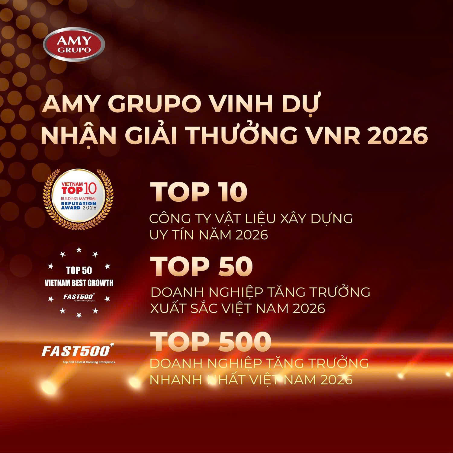 Ngày 22/4, tại Lễ công bố do Vietnam Report tổ chức tại Trung tâm Hội nghị Thiskyhall (TP.HCM), AMY GRUPO tiếp tục được vinh danh với loạt giải thưởng uy tín: