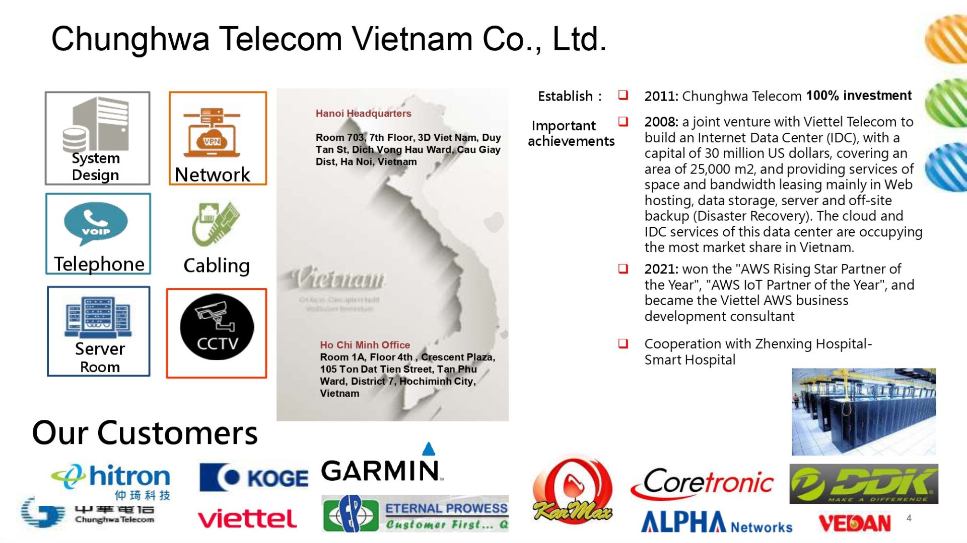 Với hơn 15 năm kinh nghiệm hoạt động tại Việt Nam, CHTVN đã từng bước xây dựng vị thế là đối tác công nghệ tin cậy của nhiều doanh nghiệp trong và ngoài nước. Công ty tập trung cung cấp các giải pháp hạ tầng viễn thông, trung tâm dữ liệu, mạng doanh nghiệp, dịch vụ CNTT tích hợp, cũng như các giải pháp số hóa phục vụ quản trị và sản xuất.