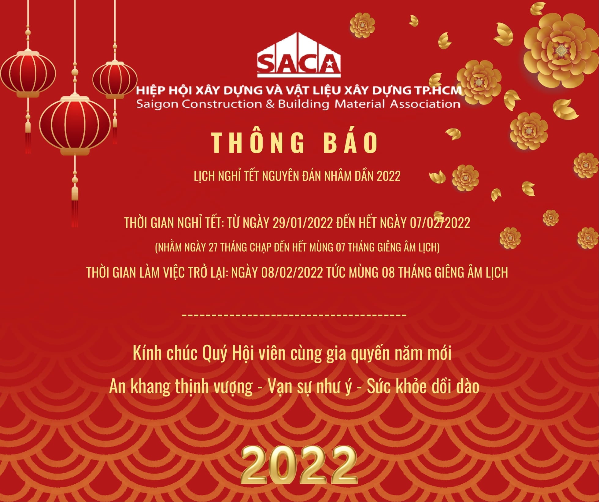 Kết thúc một năm đầy khó khăn, thử thách, Hiệp hội Xây dựng và Vật liệu xây dựng Thành phố Hồ Chí Minh (SACA) kính chúc quý Hội viên cùng gia quyến bước sang năm mới sức khỏe dồi dào, vạn sự như ý, an khang thịnh vượng; chúc cho mọi công việc đã, đang và sắp triển khai thực hiện của quý công ty Hội viên luôn được thuận buồm xuôi gió, gặt hái được nhiều thành công và cùng xây dựng Hiệp hội SACA ngày một vững mạnh.