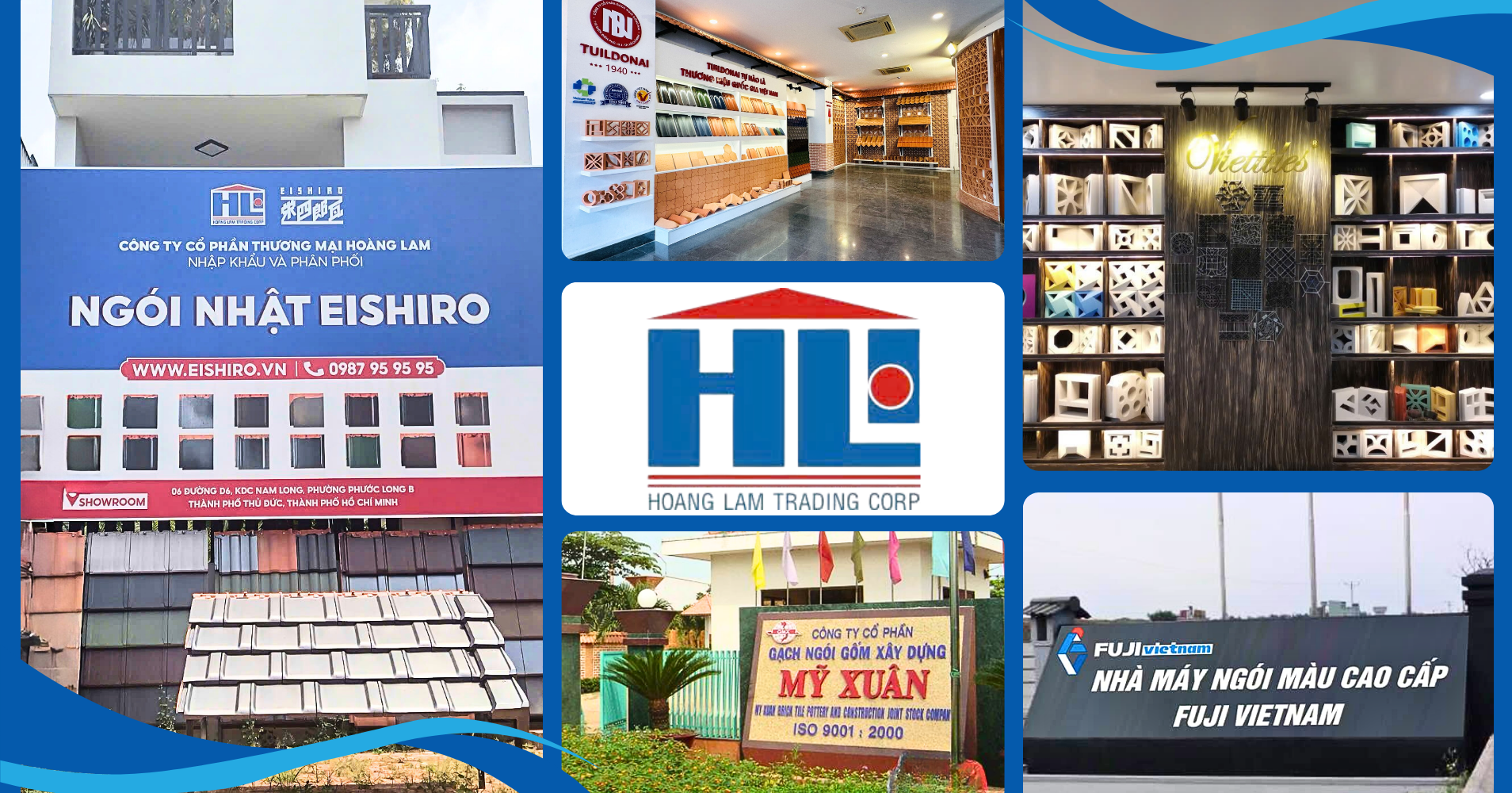 Hoàng Lam là đại lý phân phối của các thương hiệu hàng đầu Việt Nam như Tuildonai, Hạ Long, Fuji, Mỹ Xuân, Đồng Tâm, Viettiles,... Bên cạnh đó, Hoàng Lam nhập khẩu và phân phối ngói Nhật Eishiro – một thương hiệu ngói lợp chất lượng hàng đầu và lâu đời nhất ở Nhật Bản.