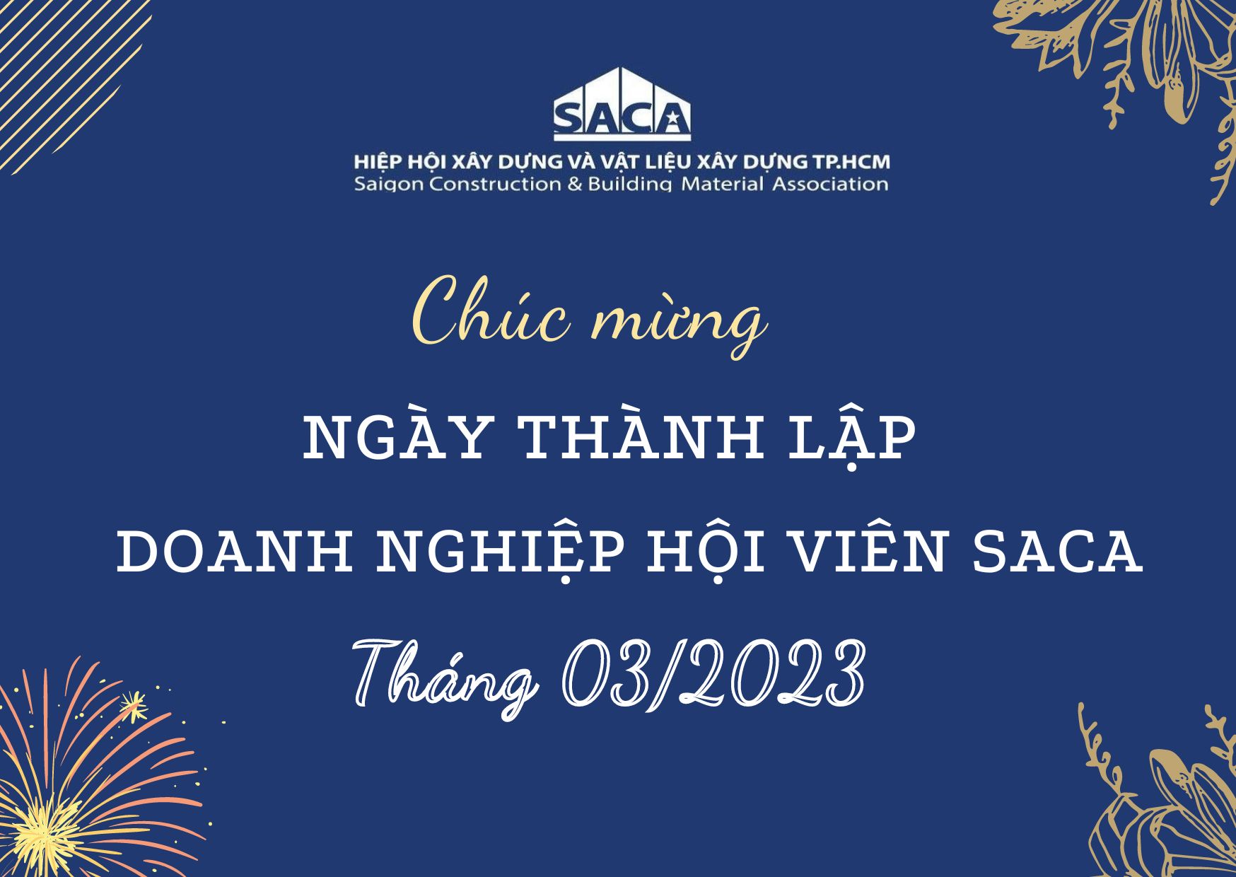 Hiệp hội Xây dựng và Vật liệu Xây dựng TP.HCM (SACA) xin gửi những lời chúc mừng tới các doanh nghiệp Hội viên Hiệp hội SACA có ngày thành lập trong tháng 03/2023. Hiệp hội SACA kính chúc doanh nghiệp Hội viên ngày một lớn mạnh và phát triển mạnh mẽ hơn nữa trong tương lai.