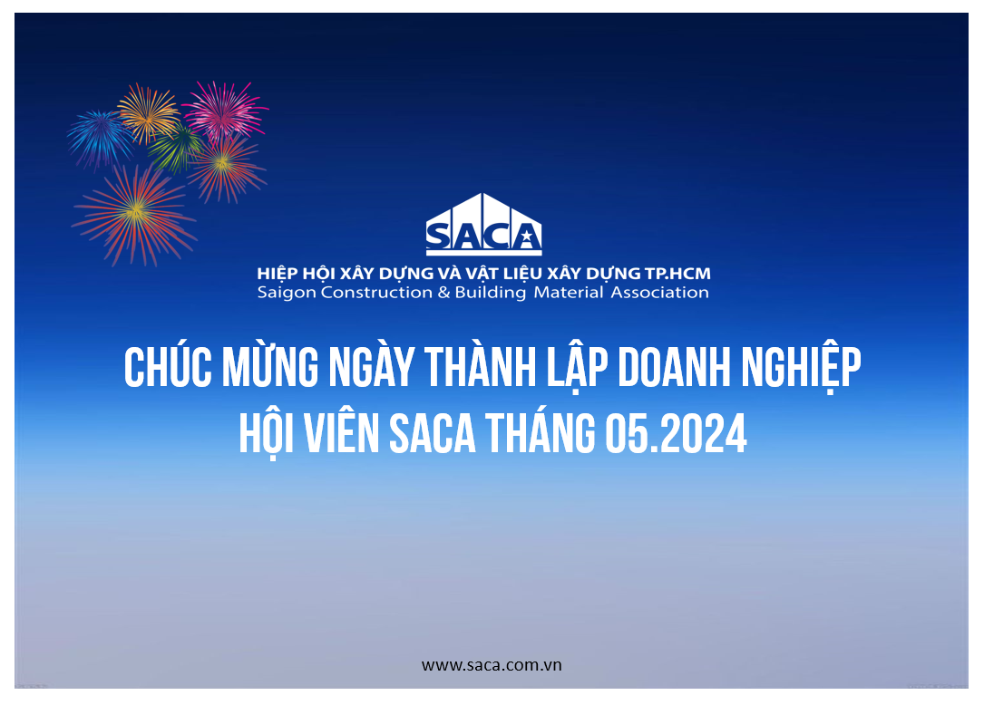 Hiệp hội Xây dựng và Vật liệu xây dựng TP.HCM (SACA) xin gửi những lời chúc mừng tới các doanh nghiệp Hội viên Hiệp hội SACA có ngày thành lập trong tháng 05.2024. Hiệp hội SACA kính chúc Quý doanh nghiệp Hội viên thành công và phát triển vững bền.