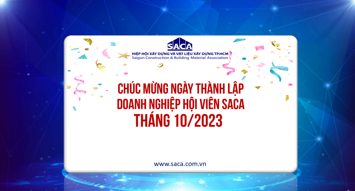 Hiệp hội Xây dựng và Vật liệu Xây dựng TP.HCM (SACA) xin gửi lời chúc mừng tốt đẹp nhất tới các doanh nghiệp Hội viên Hiệp hội SACA có ngày thành lập trong tháng 10/2023.  Hiệp hội SACA kính chúc Quý doanh nghiệp Hội viên ngày một lớn mạnh và gặt hái được nhiều thành công hơn nữa trong tương lai.