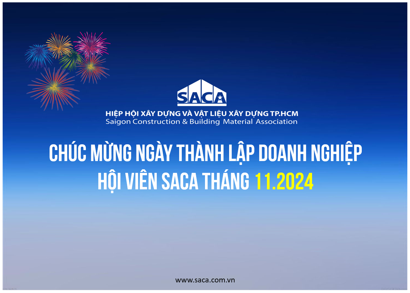 Hiệp hội Xây dựng và Vật liệu xây dựng TP.HCM (SACA) xin gửi những lời chúc mừng tốt đẹp nhất đến Quý doanh nghiệp Hội viên Hiệp hội SACA có ngày thành lập công ty trong tháng 11.2024. Hiệp hội SACA kính chúc Quý Hội viên ngày một lớn mạnh và gặt hái được nhiều thành công hơn nữa trong tương lai.