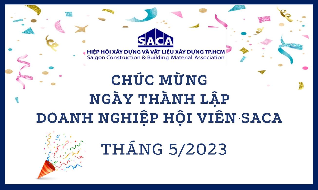 Hiệp hội Xây dựng và Vật liệu Xây dựng TP.HCM (SACA) xin gửi lời chúc mừng tốt đẹp nhất tới các doanh nghiệp Hội viên Hiệp hội SACA có ngày thành lập trong tháng 5/2023. Hiệp hội SACA kính chúc Quý doanh nghiệp Hội viên ngày một lớn mạnh và gặt hái được nhiều thành công hơn nữa trong tương lai.