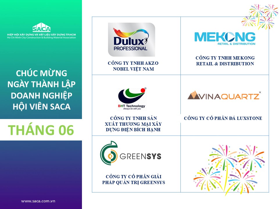 Hiệp hội Xây dựng và Vật liệu xây dựng TP.HCM (SACA) xin trân trọng gửi lời chúc mừng đến Quý Doanh nghiệp Hội viên nhân dịp kỷ niệm ngày thành lập trong tháng 06/2025. Kính chúc Quý Hội viên ngày càng phát triển vững mạnh, không ngừng vươn xa và gặt hái nhiều thành tựu rực rỡ trên hành trình kiến tạo giá trị và phát triển bền vững.
