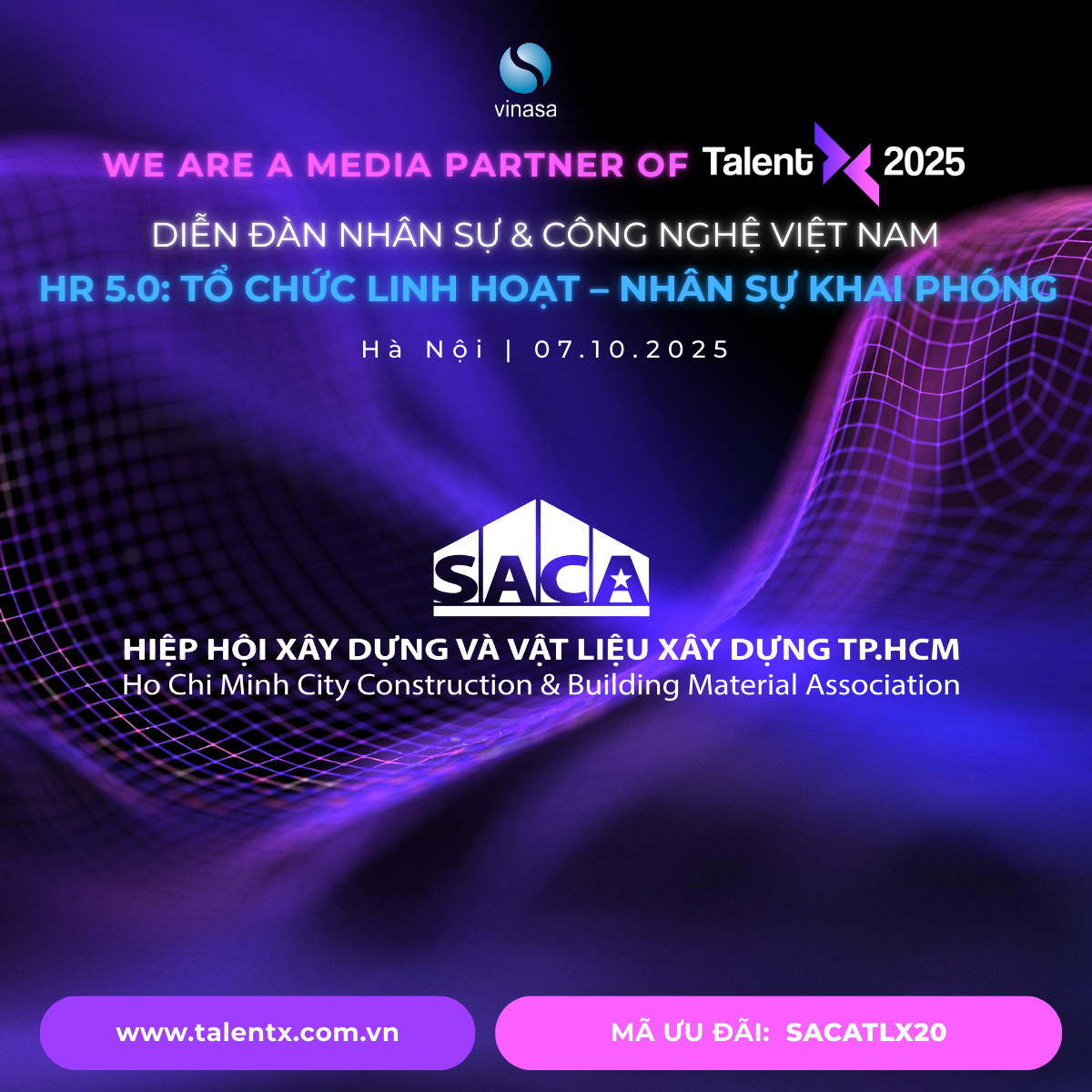 Hiệp hội Xây dựng & Vật liệu Xây dựng TP. Hồ Chí Minh (SACA) hân hạnh đồng hành cùng TalentX 2025 – Hội nghị Nhân sự & Công nghệ Nhân sự Việt Nam, sự kiện hàng đầu về quản trị và công nghệ nhân sự với chủ đề: “HR 5.0: Tổ chức Linh hoạt – Nhân sự Khai phóng”.