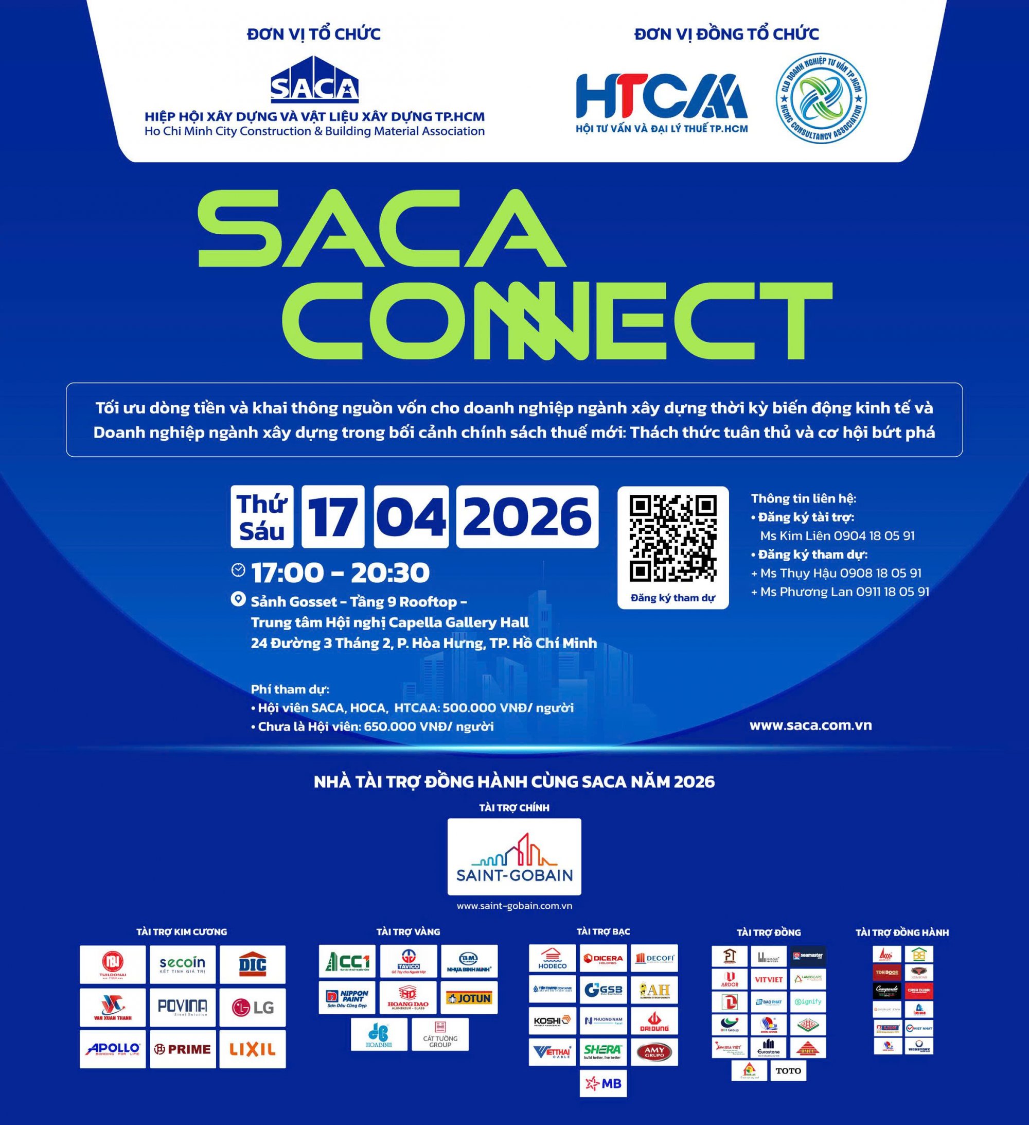 Thông tin chi tiết chương trình SACA Connect chủ đề “Tối ưu dòng tiền và khai thông nguồn vốn cho doanh nghiệp ngành xây dựng thời kỳ biến động kinh tế và Doanh nghiệp ngành xây dựng trong bối cảnh chính sách thuế mới: Thách thức tuân thủ và cơ hội bứt phá” * Nội dung chương trình: 17:00: Đón khách và check-in 17:30: Phần 1: Cập nhật thông tin Hiệp hội và ngành nghề 18:00: Phần 2: Chia sẻ của chuyên gia 19:00: Phần 3: Tiệc và giao lưu kết nối mở 20:30: Kết thúc chương trình * Phí tham dự: - Hội viên SACA, HTCAA, HOCA: 500.000 VNĐ/người - Chưa là Hội viên: 650.000 VNĐ/người * Thông tin thanh toán chuyển khoản theo thông tin sau: + Tài khoản: HIEP HOI XAY DUNG VA VAT LIEU XAY DUNG TP.HCM + Số tài khoản: 2030201991 + Tại Ngân hàng TMCP Ngoại thương Việt Nam (Vietcombank) - Chi nhánh Gia Định + Nội dung ck: Tên người tham du - SACA Connect 17.04.2026 * Thông tin liên hệ: - Đăng ký tài trợ chương trình: Ms. Phạm Kim Liên – Chánh Văn phòng | 0904 18 05 91 - Đăng ký tham dự: + Ms. Thụy Hậu - Phụ trách Truyền thông & Sự kiện| 0908 18 05 91 |