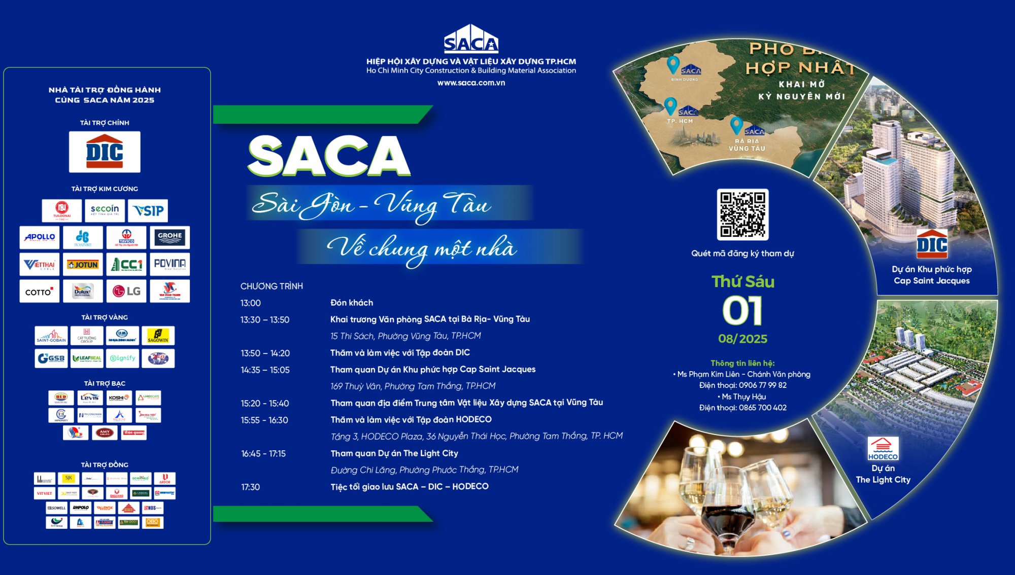 Ngày 01/08/2025 tới đây, Hiệp hội Xây dựng và Vật liệu xây dựng TP.HCM (SACA) sẽ tổ chức chương trình đặc biệt với chủ đề ''Sài Gòn – Vũng Tàu: Về chung một nhà'', đánh dấu bước phát triển quan trọng trong chiến lược mở rộng và kết nối vùng của Hiệp hội.