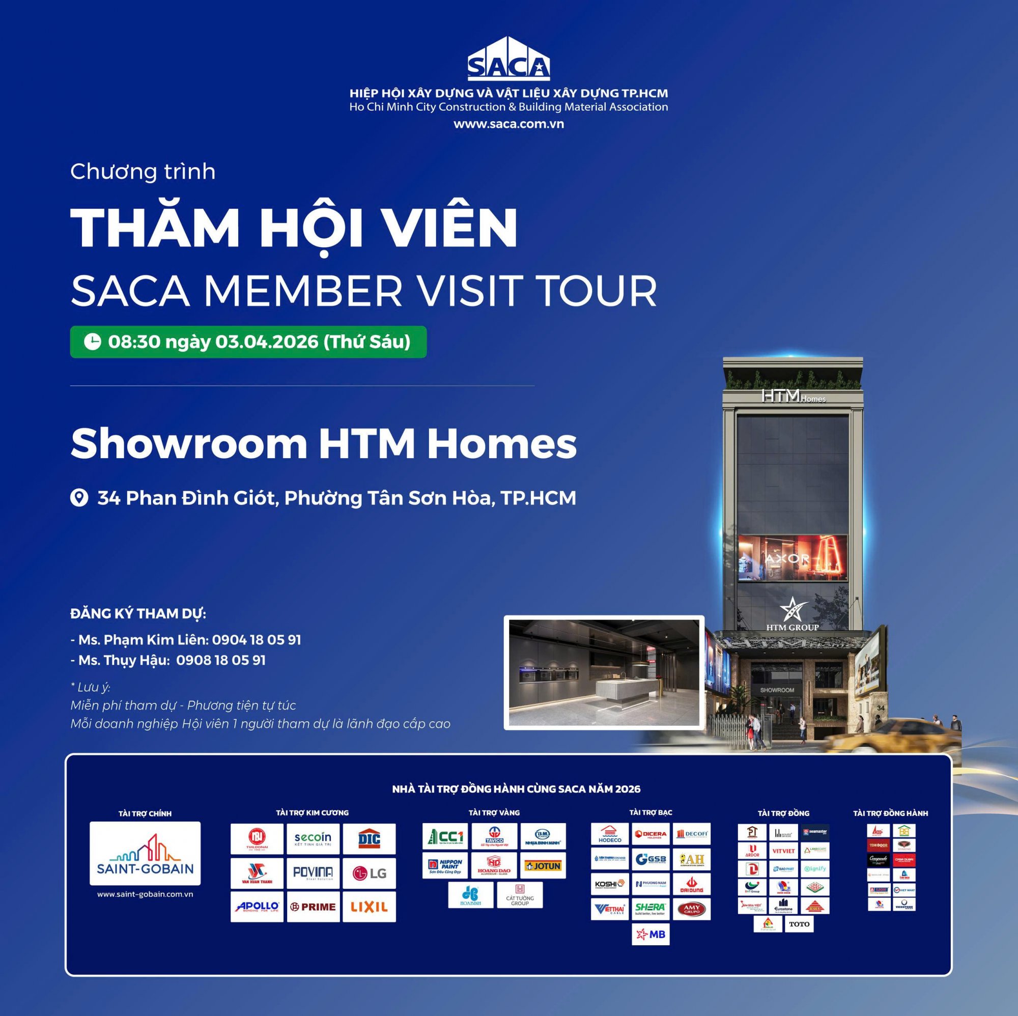 Nhằm tăng cường kết nối, trao đổi kinh nghiệm giữa các doanh nghiệp Hội viên, Hiệp hội Xây dựng và Vật liệu xây dựng TP.HCM (SACA) tổ chức chương trình “Thăm Hội viên – SACA Member Visit Tour” tại Showroom HTM Homes vào 08:30 ngày 03/04/2026 (Thứ Sáu) - 34 Phan Đình Giót, Phường Tân Sơn Hòa, TP. Hồ Chí Minh.