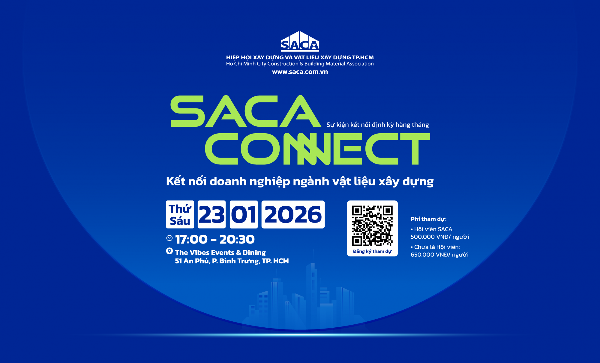 Chiều ngày 23/01 (Thứ Sáu) tới đây, Hiệp hội Xây dựng và Vật liệu xây dựng TP.HCM (SACA) sẽ tổ chức chương trình SACA Connect với chủ đề “Kết nối doanh nghiệp ngành vật liệu xây dựng”, tại The Vibes Events & Dining - 51 An Phú, Phường Bình Trưng, TP. HCM.