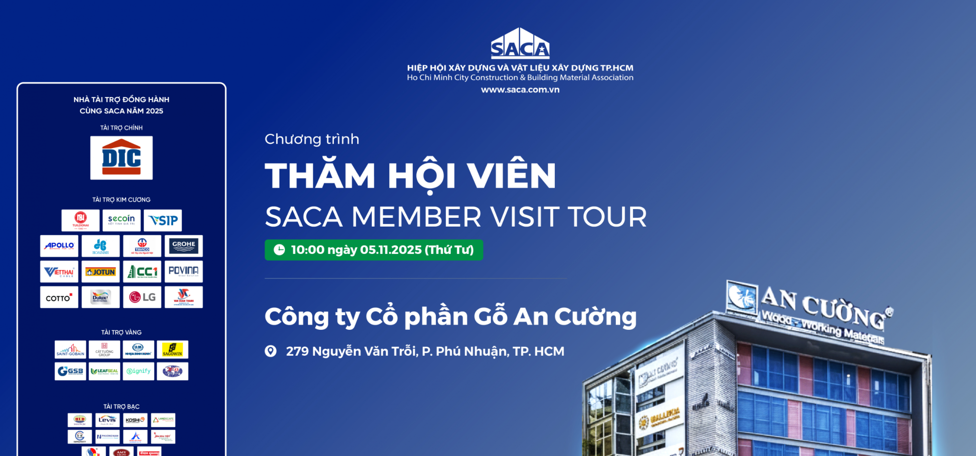 Nhằm tăng cường kết nối, trao đổi kinh nghiệm giữa các doanh nghiệp hội viên, Hiệp hội Xây dựng và Vật liệu xây dựng TP.HCM (SACA) tổ chức chương trình “Thăm Hội viên – SACA Member Visit Tour” tại Công ty Cổ phần Gỗ An Cường vào 10:00 ngày 05/11/2025 (Thứ Tư) tại địa điểm: 279 Nguyễn Văn Trỗi, P. Phú Nhuận, TP. Hồ Chí Minh.