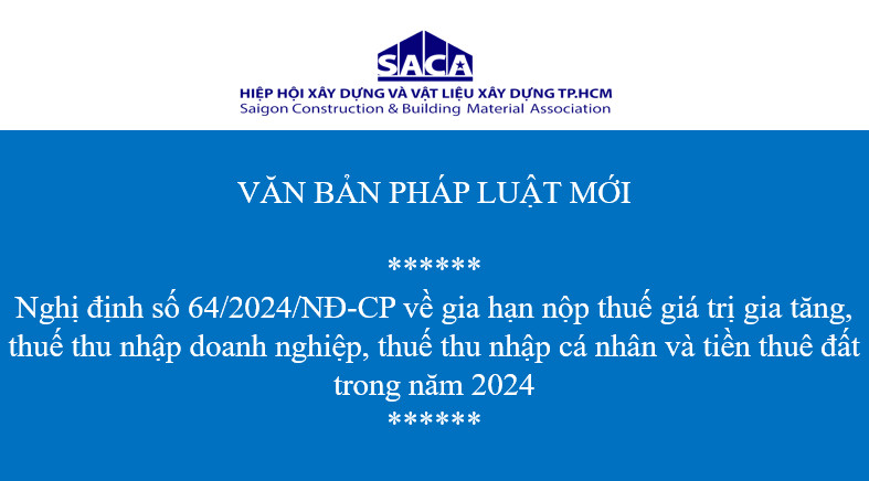 NGHỊ ĐỊNH SỐ 64/2024/NĐ-CP VỀ GIA HẠN NỘP THUẾ GIÁ TRỊ GIA TĂNG, THUẾ THU NHẬP DOANH NGHIỆP, THUẾ THU NHẬP CÁ NHÂN VÀ TIỀN THUÊ ĐẤT TRONG NĂM 2024