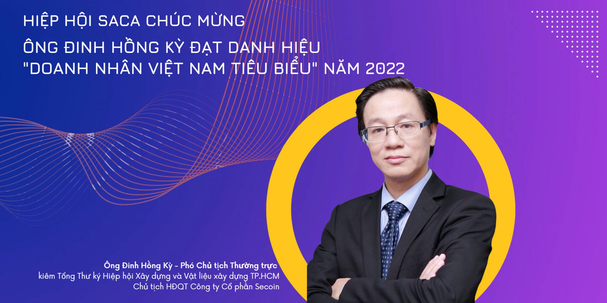 Ông Đinh Hồng Kỳ - Phó Chủ tịch Thường trực kiêm Tổng Thư ký Hiệp hội SACA - Chủ tịch HĐQT Công ty Cổ phần Secoin Các thành tích, giải thưởng đã đạt được: - Bằng khen của Thủ tướng Chính Phủ năm 2019; - Bằng khen của Bộ Xây Dựng năm 2013, 2019; - Bằng khen của UBND TP. HCM năm 2019; - Bằng khen của UBND TP. Hà Nội năm 2004, 2007, 2014, 2019; - Huy hiệu TP. Hồ Chí Minh do UBND TP. HCM trao tặng năm 2021; - Doanh nhân TP. HCM tiêu biểu do UBND TP. HCM công nhận năm 2016-2018, 2018-2020, 2020-2022, 2022-2024; - Doanh nhân Việt Nam tiêu biểu 2019, 2020 do VCCI công nhận; - Bằng khen của BCH TW Đoàn Thanh niên Cộng sản Hồ Chí Minh năm 2006; - Bằng chứng nhận của UBTW Hội các nhà doanh nghiệp trẻ Việt Nam năm 2004; - Bằng khen của Hội Liên hiệp Thanh niên Việt Nam năm 2007; - Top 10 Nhà đầu tư tiên phong năm 2021-2022; - Bãn lĩnh doanh nhân lập nghiệp 2014 (Entrepreneur of The Year 2014); - Mark of Repest 2014 với Giải thưởng nhà lãnh đạo doanh nghiệp sáng tạo nhất; - Top 10 Doanh nhân trẻ Thăng Long năm 2004; |