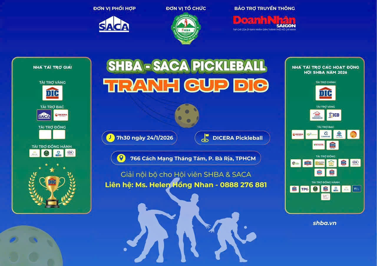 Nhằm thúc đẩy phong trào rèn luyện thể thao, nâng cao sức khỏe và tăng cường kết nối cộng đồng doanh nghiệp, Hiệp hội Xây dựng và Vật liệu Xây dựng TP. Hồ Chí Minh (SACA) phối hợp cùng Hội Doanh nghiệp Nam TP.HCM (SHBA) tổ chức Giải Pickleball SHBA – SACA Tranh Cúp DIC, diễn ra vào ngày 24/01/2026.