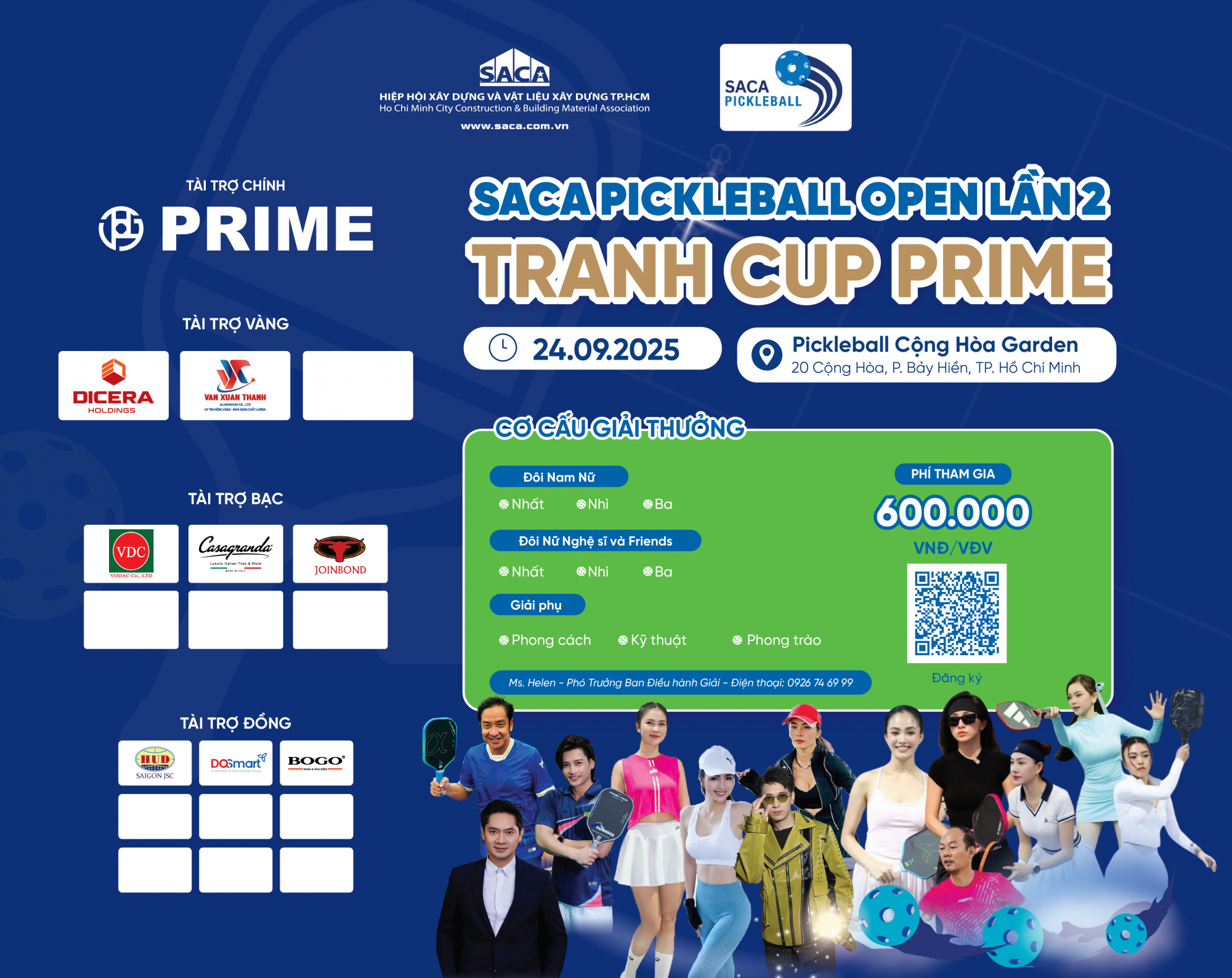 Ngày 24/9/2025 tới đây, cộng đồng Pickleball TP.HCM sẽ sôi động hơn bao giờ hết khi Giải SACA Pickleball Open lần thứ 2 – Tranh Cup Prime sẽ chính thức khởi tranh tại Pickleball Cộng Hòa Garden (20 Cộng Hoà, P. Bảy Hiền, TP.HCM). Đây là giải đấu do Ban Văn hóa - Thể thao - Xã hội Hiệp hội Xây dựng và Vật liệu xây dựng TP.HCM (SACA) tổ chức, hứa hẹn trở thành một sự kiện thể thao – giao lưu – kết nối đặc sắc. Giải đấu được tài trợ chính bởi Công ty TNHH MTV Thương mại và Xuất nhập khẩu Prime.