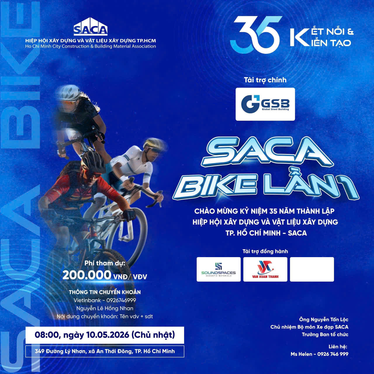 Nằm trong chuỗi hoạt động kỷ niệm 35 năm thành lập (1991 – 2026), Ban Văn hóa - Thể thao - Xã hội Hiệp hội Xây dựng và Vật liệu xây dựng TP. Hồ Chí Minh (SACA) sẽ tổ chức giao lưu xe đạp Giải SACA Bike Lần 1 – dành cho cộng đồng doanh nghiệp và những người yêu thích bộ môn xe đạp.
