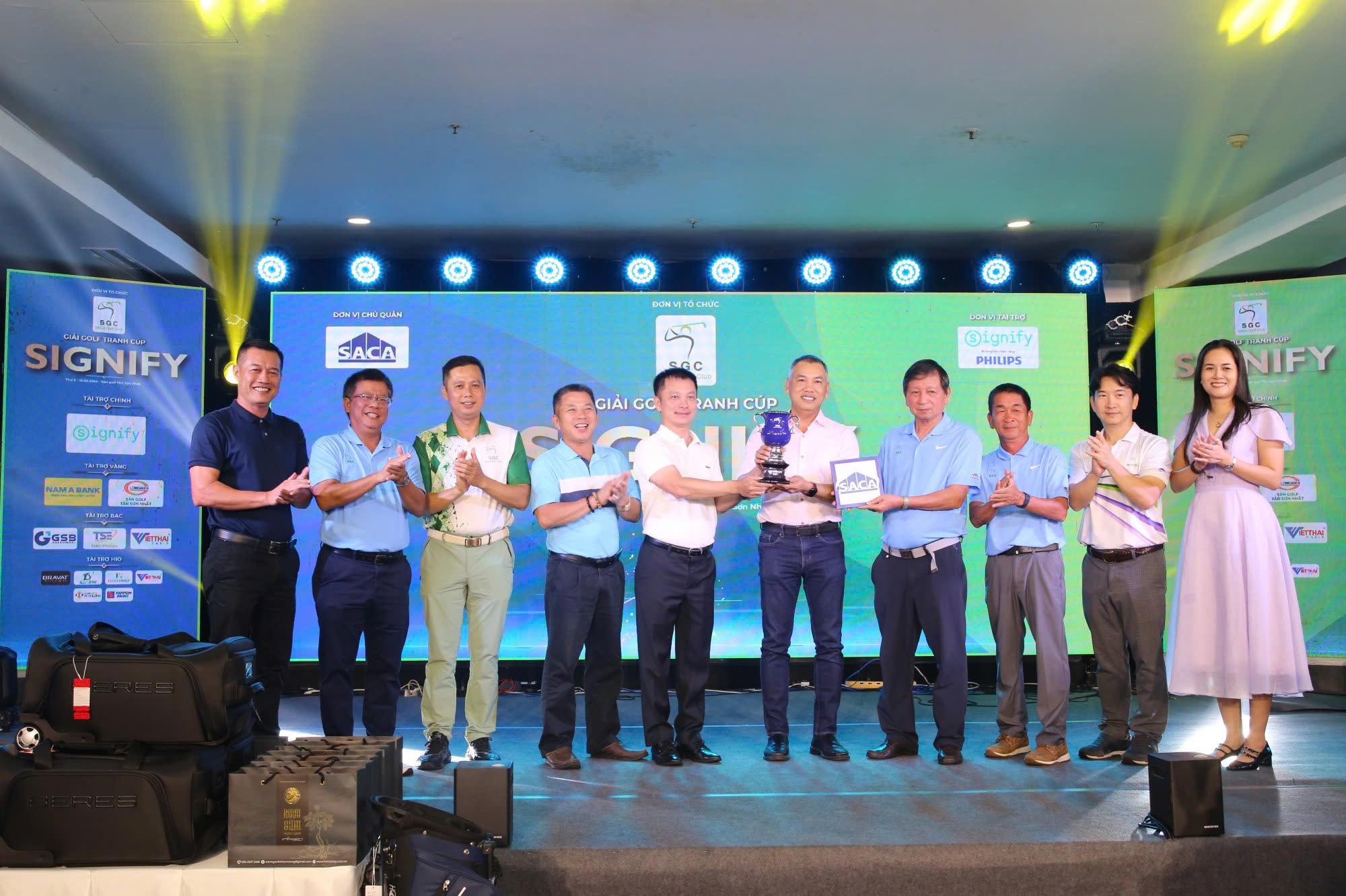 Ông Sử Ngọc Danh - Phó Tổng Giám đốc Signify Việt Nam, đại diện Nhà tài trợ Chính giải đấu “Tranh Cup Signify” chuyển giao Cup luân lưu cho ông Đồng Mai Lâm - Tổng Giám Đốc Schneider Việt Nam