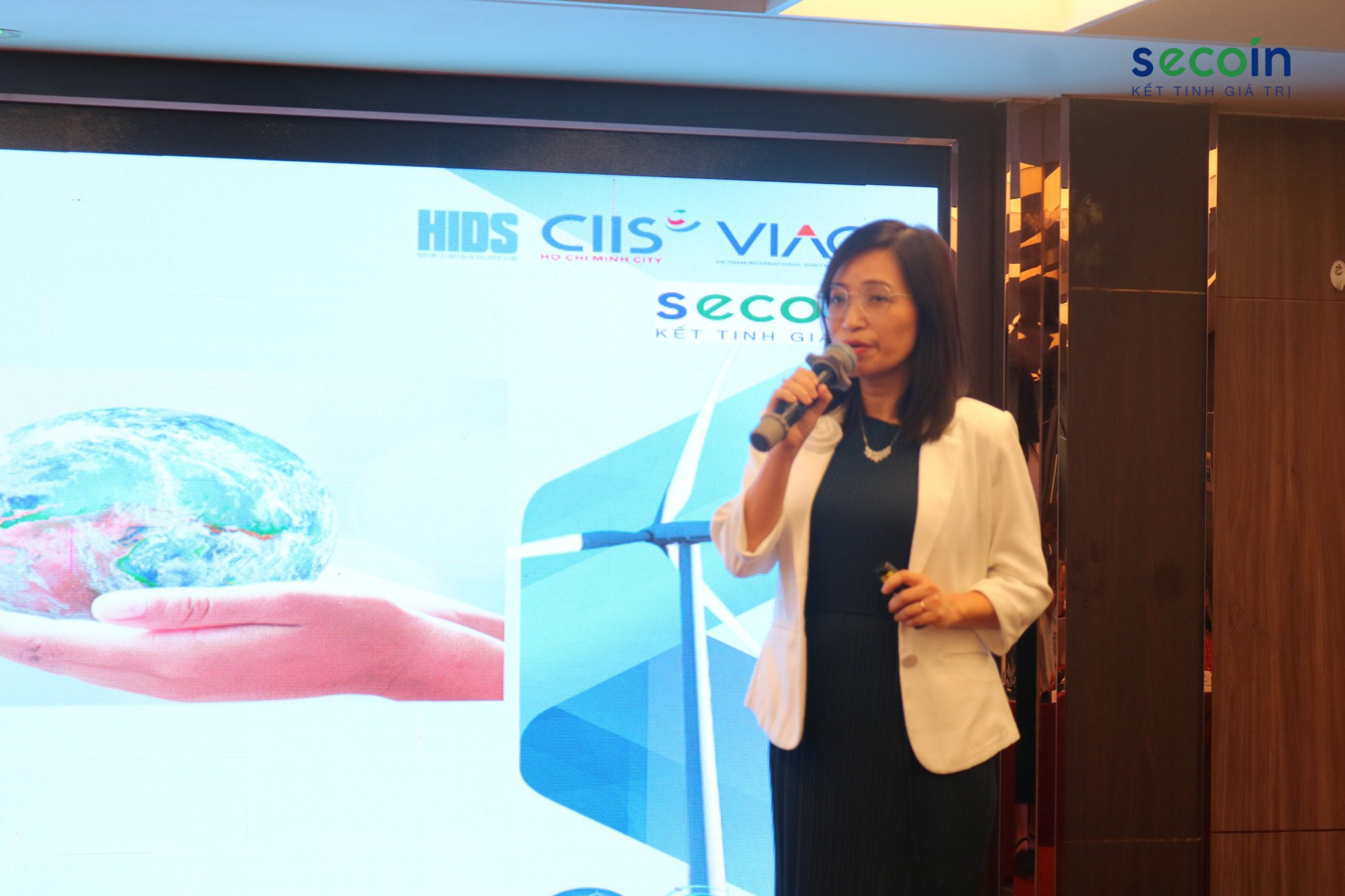 Tại buổi Hội thảo, bà Võ Thị Liên Hương - Tổng Giám đốc công ty Cổ phần Secoin đã có những chia sẻ về bức tranh ngành vật liệu xây dựng trên thế giới, các mục tiêu SDGs chính của Secoin, xác định lĩnh vực trọng yếu ESG, và kinh nghiệm thực tế khi triển khai hoạt động phát triển bền vững cho Doanh nghiệp, đặc biệt về Quản lý chuỗi cung ứng xanh và xây dựng nhà máy theo tiêu chuẩn xanh - sản xuất tinh gọn.