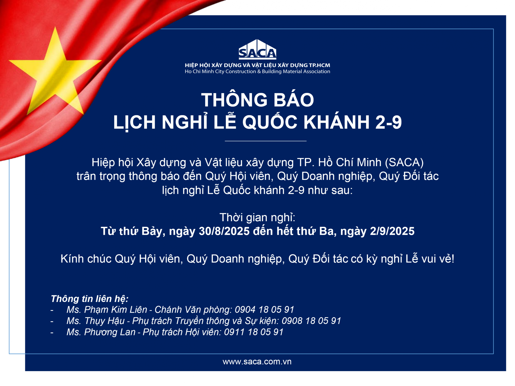 Hiệp hội Xây dựng và Vật liệu xây dựng TP. Hồ Chí Minh (SACA) trân trọng thông báo đến Quý Hội viên, Quý Doanh nghiệp, Quý Đối tác lịch nghỉ Lễ Quốc khánh 2-9 như sau:
