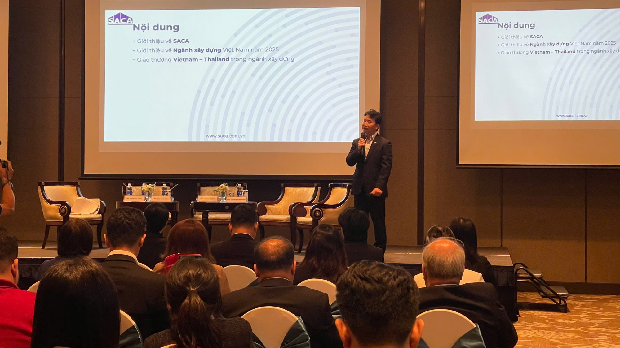 Ông Ngô Hoài Đức - Phó Tổng Thư ký, Trưởng Ban Khoa học Công nghệ Hiệp hội SACA có bài trình bày giới thiệu về Hiệp hội cũng như tình hình ngành xây dựng Việt Nam hiện nayĐại diện SACA, ông Ngô Hoài Đức - Phó Tổng Thư ký, Trưởng Ban Khoa học Công nghệ đã có bài trình bày quan trọng, giới thiệu về Hiệp hội cũng như tình hình ngành xây dựng Việt Nam hiện nay. Đây là cơ hội để các doanh nghiệp Thái Lan hiểu rõ hơn về nhu cầu, tiềm năng và những cơ hội hợp tác tại thị trường Việt Nam.