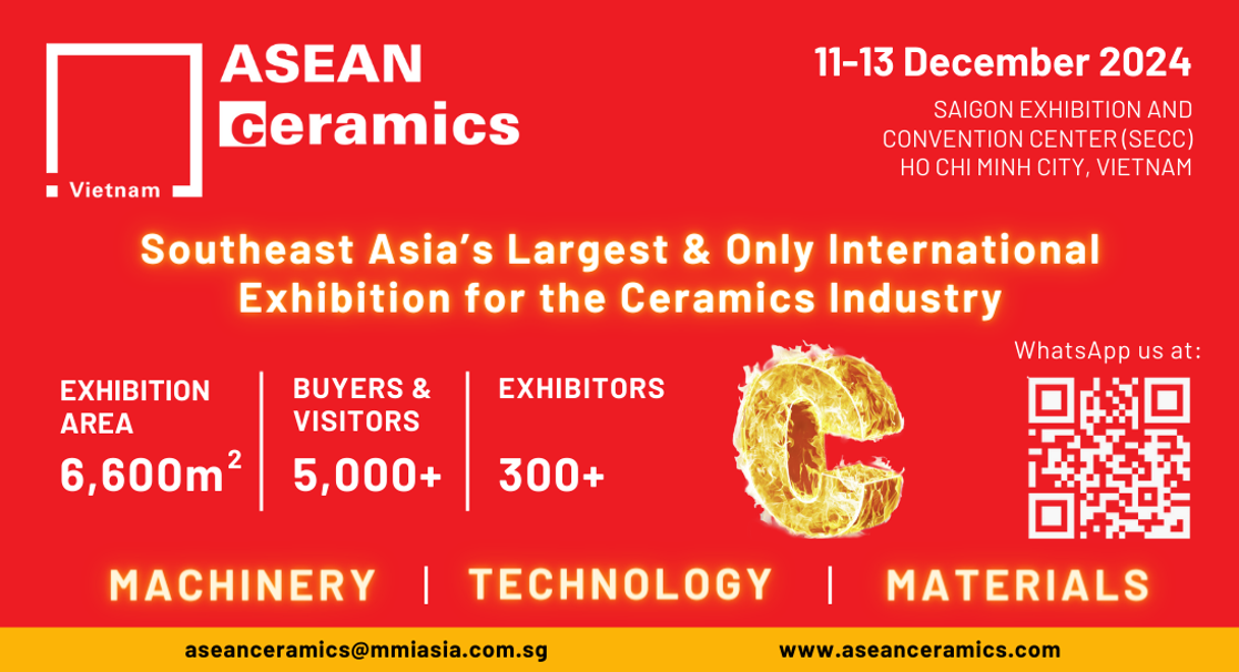 Triển lãm Asean Ceramics 2024 sẽ diễn ra từ ngày 11 – 13/12/2024 tại Trung tâm Triển lãm Sài Gòn (SECC), TP. Hồ Chí Minh với sự phối hợp tổ chức của MMI Asia thuộc tập đoàn Triển lãm Messe München GmbH (Đức) và Hiệp hội Gốm sứ Xây dựng Việt Nam (VIBCA) cùng sự tư vấn của Công ty dịch vụ Triển lãm Á Châu (AES). Với sự bảo trợ của Bộ Xây dựng Việt Nam và các hiệp hội thương mại trong và ngoài nước, Triển lãm với diện tích trưng bày 6.600 m2, dự kiến thu hút hơn 300 công ty tham gia gian hàng và thu hút trên 5.000 khách tham quan thương mại sẽ là sự kiện lớn thúc đẩy vai trò của khu vực Đông Nam Á trong sự phát triển gốm sứ toàn cầu khi khu vực này tiếp tục tăng trưởng mạnh về quy mô và tầm ảnh hưởng trên khắp thế giới.
