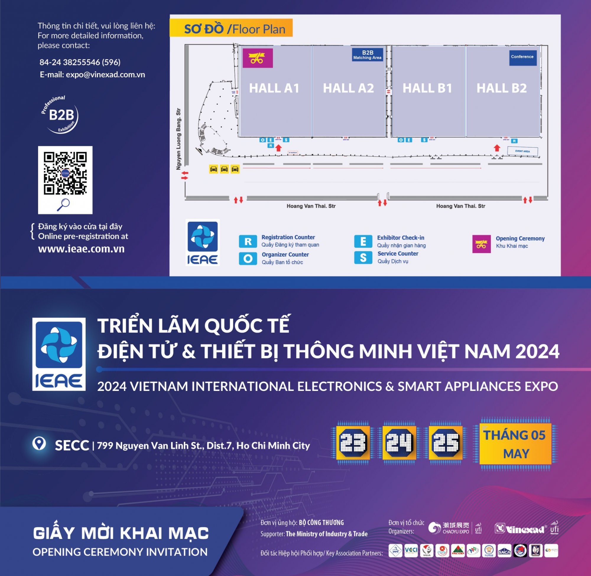 IEAE Việt Nam là thương hiệu triển lãm duy nhất trong lĩnh vực Điện tử & Thiết bị thông minh được đồng tổ chức bởi Công ty VINEXAD và CHAOYU EXPO, diễn ra từ ngày 23 ~ 25/05/2024 tại Tp. Hồ Chí Minh và từ ngày 30/10 ~ 01/11 tại Thủ đô Hà Nội.