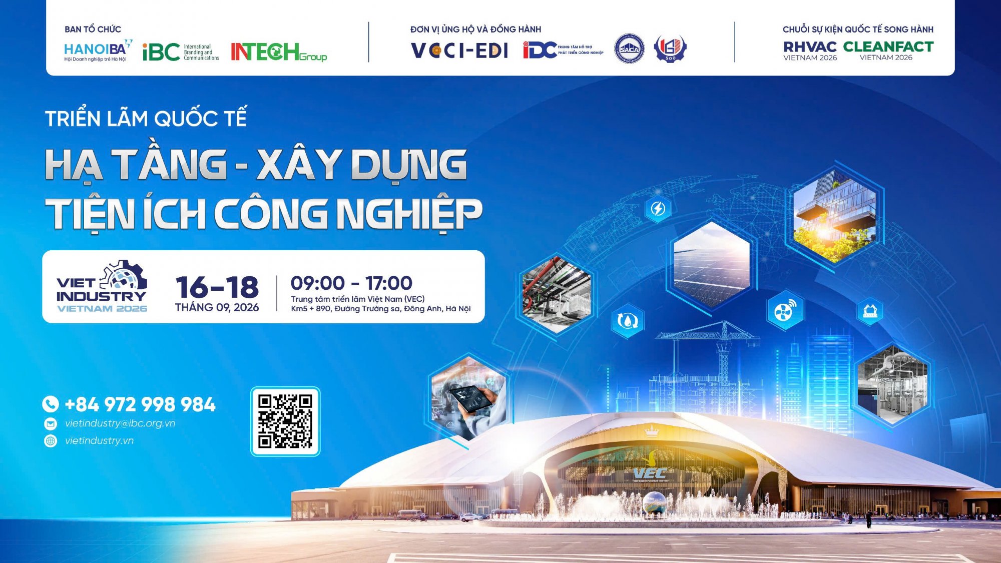 Tiếp nối hiệu quả kết nối, chất lượng chuyên môn và giá trị xúc tiến hợp tác trong qua 5 năm tổ chức, Viet Industry 2026 - Triển lãm Quốc tế về hạ tầng, xây dựng và tiện ích công nghiệp, tổ chức song hành cùng CLEANFACT & RHVAC VIETNAM 2026 sẽ chính thức trở lại Hà Nội từ 16–18/09/2026 tại Trung tâm Triển lãm Việt Nam (VEC), Đông Anh, Hà Nội với quy mô 500 gian hàng, 15.000+ khách tham quan và hơn 10.000m2 trưng bày.